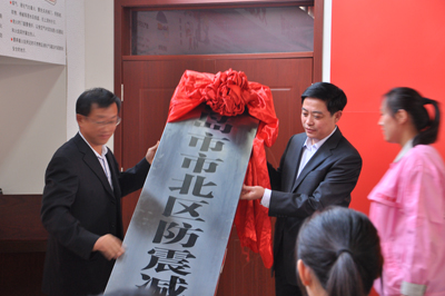 青島市地震局局長郭玉貴、市北區區委常委副區長于洋共同為“市北區防震減災宣傳教育基地”揭牌
