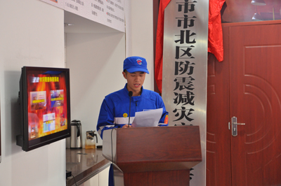 青島市市北區海麗地震救援志愿者隊伍授旗暨海麗雅防震減災宣傳教育基地揭牌儀式,海麗雅集團董事長張旭明發表講話