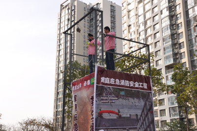 億和海麗的工作人員現場展示借助高層樓宇緩降器進行高層逃生