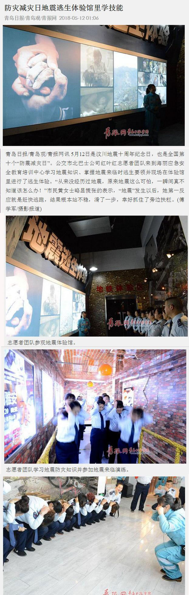 5月12日是汶川地震十周年紀念日,也是全國第十個“防震減災日”。公交市北巴士公司紅葉紅志愿者團隊來到海麗應急安全教育培訓中心學習地震知識、掌握地震來臨時逃生要領(lǐng)并現(xiàn)場在體驗館里進行了逃生體驗。“從來沒經(jīng)歷過地震,原來地震這么可怕,一瞬間真不知道該怎么辦!”市民黃女士略顯慌張的表示,“地震”發(fā)生以后,她第一反應就是趕快逃跑,結(jié)果根本站不穩(wěn),滑了一步,幸好抓住了旁邊扶欄。