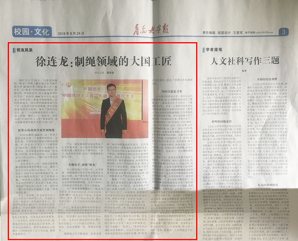【青島大學報】以“徐連龍:制繩領域的大國工匠”為題,對徐連龍工匠精神進行報道。